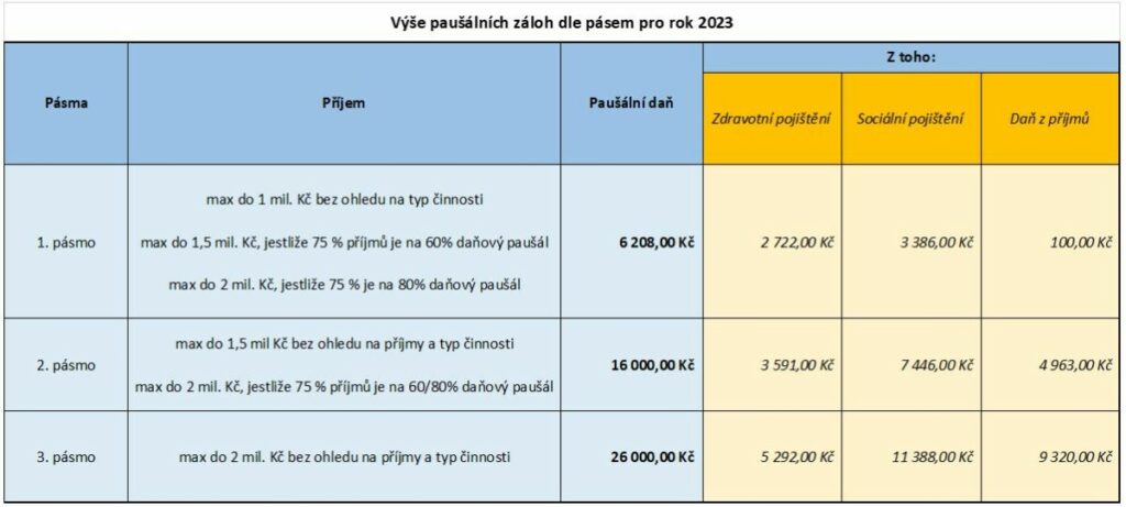 Od ledna 2021 se mohou podnikatelé dobrovolně přihlásit k platbě paušální daně. Tato daň platí pro malé živnostníky, kteří jsou neplátci DPH. Paušální daň se nově dělí na 3 pásma podle příjmů ze samostatné činnosti: